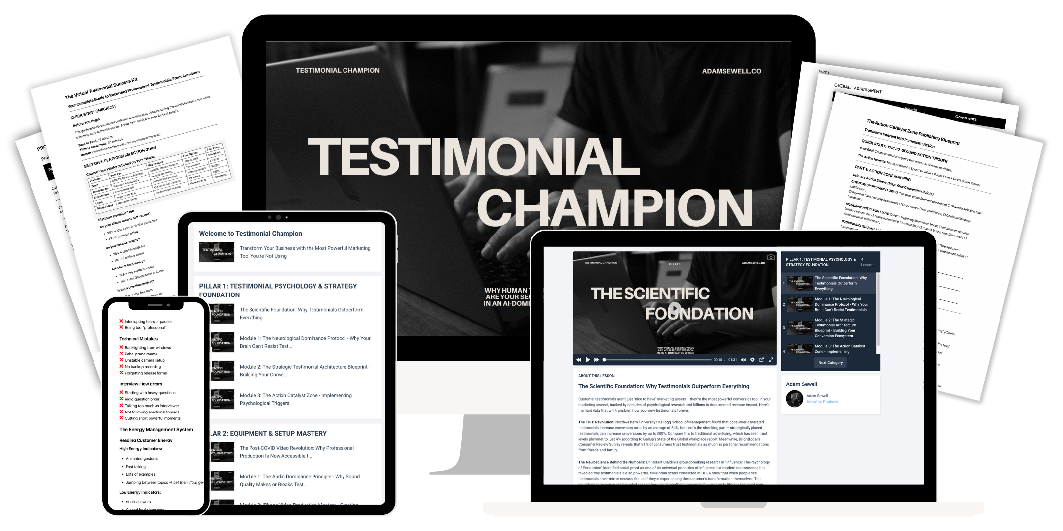 Absolutely. This course was designed for people with zero video production experience. We walk you step-by-step through equipment setup, filming, editing, and distribution. By the end, you’ll have professional-quality testimonials that rival $10k production companies — without the learning curve or expensive gear.
